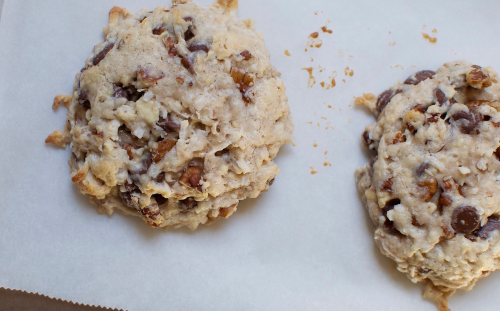 Oyster Cracker, Unbleached All-Purpose Flour, Butter, Baking Powder, Unsweetened Coconut, Pecan, Semi-Sweet Chocolate Chips, Milk, Soy Lecithin, and Sweet Condensed Milk